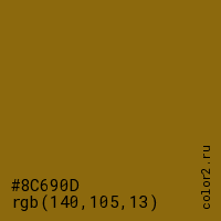 Цвет #8C690D в цветовой модели RGB обозначается тремя октетами (140, 105, 13) в десятичном формате и #8C690D в шестнадцатиричном (hex) формате, которые являются интенсивностью красного 140 (hex 8C), интенсивность зелёного 105 (hex 69) и интенсивность синего 13 (hex 0D).