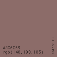 Цвет #8C6C69 в цветовой модели RGB обозначается тремя октетами (140, 108, 105) в десятичном формате и #8C6C69 в шестнадцатиричном (hex) формате, которые являются интенсивностью красного 140 (hex 8C), интенсивность зелёного 108 (hex 6C) и интенсивность синего 105 (hex 69).