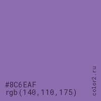 Цвет #8C6EAF в цветовой модели RGB обозначается тремя октетами (140, 110, 175) в десятичном формате и #8C6EAF в шестнадцатиричном (hex) формате, которые являются интенсивностью красного 140 (hex 8C), интенсивность зелёного 110 (hex 6E) и интенсивность синего 175 (hex AF).