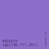 Цвет #8C6FC9 в цветовой модели RGB обозначается тремя октетами (140, 111, 201) в десятичном формате и #8C6FC9 в шестнадцатиричном (hex) формате, которые являются интенсивностью красного 140 (hex 8C), интенсивность зелёного 111 (hex 6F) и интенсивность синего 201 (hex C9).