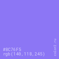 Цвет #8C76F5 в цветовой модели RGB обозначается тремя октетами (140, 118, 245) в десятичном формате и #8C76F5 в шестнадцатиричном (hex) формате, которые являются интенсивностью красного 140 (hex 8C), интенсивность зелёного 118 (hex 76) и интенсивность синего 245 (hex F5).