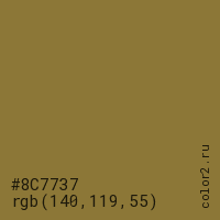 Цвет #8C7737 в цветовой модели RGB обозначается тремя октетами (140, 119, 55) в десятичном формате и #8C7737 в шестнадцатиричном (hex) формате, которые являются интенсивностью красного 140 (hex 8C), интенсивность зелёного 119 (hex 77) и интенсивность синего 55 (hex 37).