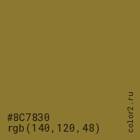 Цвет #8C7830 в цветовой модели RGB обозначается тремя октетами (140, 120, 48) в десятичном формате и #8C7830 в шестнадцатиричном (hex) формате, которые являются интенсивностью красного 140 (hex 8C), интенсивность зелёного 120 (hex 78) и интенсивность синего 48 (hex 30).