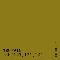 Цвет #8C7918 в цветовой модели RGB обозначается тремя октетами (140, 121, 24) в десятичном формате и #8C7918 в шестнадцатиричном (hex) формате, которые являются интенсивностью красного 140 (hex 8C), интенсивность зелёного 121 (hex 79) и интенсивность синего 24 (hex 18).