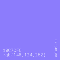 Цвет #8C7CFC в цветовой модели RGB обозначается тремя октетами (140, 124, 252) в десятичном формате и #8C7CFC в шестнадцатиричном (hex) формате, которые являются интенсивностью красного 140 (hex 8C), интенсивность зелёного 124 (hex 7C) и интенсивность синего 252 (hex FC).