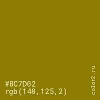 Цвет #8C7D02 в цветовой модели RGB обозначается тремя октетами (140, 125, 2) в десятичном формате и #8C7D02 в шестнадцатиричном (hex) формате, которые являются интенсивностью красного 140 (hex 8C), интенсивность зелёного 125 (hex 7D) и интенсивность синего 2 (hex 02).