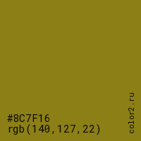 Цвет #8C7F16 в цветовой модели RGB обозначается тремя октетами (140, 127, 22) в десятичном формате и #8C7F16 в шестнадцатиричном (hex) формате, которые являются интенсивностью красного 140 (hex 8C), интенсивность зелёного 127 (hex 7F) и интенсивность синего 22 (hex 16).