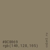 Цвет #8C8069 в цветовой модели RGB обозначается тремя октетами (140, 128, 105) в десятичном формате и #8C8069 в шестнадцатиричном (hex) формате, которые являются интенсивностью красного 140 (hex 8C), интенсивность зелёного 128 (hex 80) и интенсивность синего 105 (hex 69).