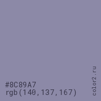 Цвет #8C89A7 в цветовой модели RGB обозначается тремя октетами (140, 137, 167) в десятичном формате и #8C89A7 в шестнадцатиричном (hex) формате, которые являются интенсивностью красного 140 (hex 8C), интенсивность зелёного 137 (hex 89) и интенсивность синего 167 (hex A7).