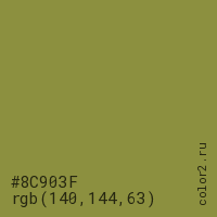 Цвет #8C903F в цветовой модели RGB обозначается тремя октетами (140, 144, 63) в десятичном формате и #8C903F в шестнадцатиричном (hex) формате, которые являются интенсивностью красного 140 (hex 8C), интенсивность зелёного 144 (hex 90) и интенсивность синего 63 (hex 3F).