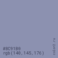 Цвет #8C91B0 в цветовой модели RGB обозначается тремя октетами (140, 145, 176) в десятичном формате и #8C91B0 в шестнадцатиричном (hex) формате, которые являются интенсивностью красного 140 (hex 8C), интенсивность зелёного 145 (hex 91) и интенсивность синего 176 (hex B0).