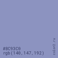 Цвет #8C93C0 в цветовой модели RGB обозначается тремя октетами (140, 147, 192) в десятичном формате и #8C93C0 в шестнадцатиричном (hex) формате, которые являются интенсивностью красного 140 (hex 8C), интенсивность зелёного 147 (hex 93) и интенсивность синего 192 (hex C0).
