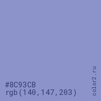 Цвет #8C93CB в цветовой модели RGB обозначается тремя октетами (140, 147, 203) в десятичном формате и #8C93CB в шестнадцатиричном (hex) формате, которые являются интенсивностью красного 140 (hex 8C), интенсивность зелёного 147 (hex 93) и интенсивность синего 203 (hex CB).