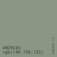 Цвет #8C9685 в цветовой модели RGB обозначается тремя октетами (140, 150, 133) в десятичном формате и #8C9685 в шестнадцатиричном (hex) формате, которые являются интенсивностью красного 140 (hex 8C), интенсивность зелёного 150 (hex 96) и интенсивность синего 133 (hex 85).