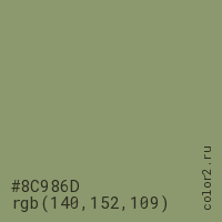 Цвет #8C986D в цветовой модели RGB обозначается тремя октетами (140, 152, 109) в десятичном формате и #8C986D в шестнадцатиричном (hex) формате, которые являются интенсивностью красного 140 (hex 8C), интенсивность зелёного 152 (hex 98) и интенсивность синего 109 (hex 6D).
