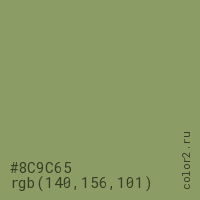 Цвет #8C9C65 в цветовой модели RGB обозначается тремя октетами (140, 156, 101) в десятичном формате и #8C9C65 в шестнадцатиричном (hex) формате, которые являются интенсивностью красного 140 (hex 8C), интенсивность зелёного 156 (hex 9C) и интенсивность синего 101 (hex 65).