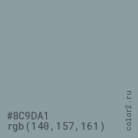 Цвет #8C9DA1 в цветовой модели RGB обозначается тремя октетами (140, 157, 161) в десятичном формате и #8C9DA1 в шестнадцатиричном (hex) формате, которые являются интенсивностью красного 140 (hex 8C), интенсивность зелёного 157 (hex 9D) и интенсивность синего 161 (hex A1).