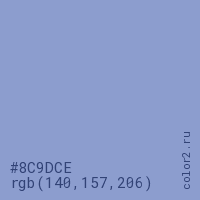 Цвет #8C9DCE в цветовой модели RGB обозначается тремя октетами (140, 157, 206) в десятичном формате и #8C9DCE в шестнадцатиричном (hex) формате, которые являются интенсивностью красного 140 (hex 8C), интенсивность зелёного 157 (hex 9D) и интенсивность синего 206 (hex CE).