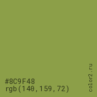Цвет #8C9F48 в цветовой модели RGB обозначается тремя октетами (140, 159, 72) в десятичном формате и #8C9F48 в шестнадцатиричном (hex) формате, которые являются интенсивностью красного 140 (hex 8C), интенсивность зелёного 159 (hex 9F) и интенсивность синего 72 (hex 48).