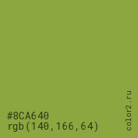 Цвет #8CA640 в цветовой модели RGB обозначается тремя октетами (140, 166, 64) в десятичном формате и #8CA640 в шестнадцатиричном (hex) формате, которые являются интенсивностью красного 140 (hex 8C), интенсивность зелёного 166 (hex A6) и интенсивность синего 64 (hex 40).