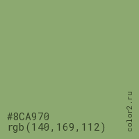 Цвет #8CA970 в цветовой модели RGB обозначается тремя октетами (140, 169, 112) в десятичном формате и #8CA970 в шестнадцатиричном (hex) формате, которые являются интенсивностью красного 140 (hex 8C), интенсивность зелёного 169 (hex A9) и интенсивность синего 112 (hex 70).