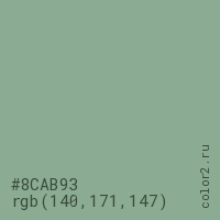 Цвет #8CAB93 в цветовой модели RGB обозначается тремя октетами (140, 171, 147) в десятичном формате и #8CAB93 в шестнадцатиричном (hex) формате, которые являются интенсивностью красного 140 (hex 8C), интенсивность зелёного 171 (hex AB) и интенсивность синего 147 (hex 93).