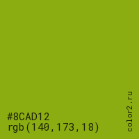 Цвет #8CAD12 в цветовой модели RGB обозначается тремя октетами (140, 173, 18) в десятичном формате и #8CAD12 в шестнадцатиричном (hex) формате, которые являются интенсивностью красного 140 (hex 8C), интенсивность зелёного 173 (hex AD) и интенсивность синего 18 (hex 12).
