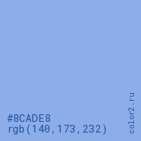 Цвет #8CADE8 в цветовой модели RGB обозначается тремя октетами (140, 173, 232) в десятичном формате и #8CADE8 в шестнадцатиричном (hex) формате, которые являются интенсивностью красного 140 (hex 8C), интенсивность зелёного 173 (hex AD) и интенсивность синего 232 (hex E8).