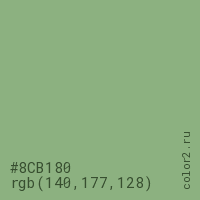 Цвет #8CB180 в цветовой модели RGB обозначается тремя октетами (140, 177, 128) в десятичном формате и #8CB180 в шестнадцатиричном (hex) формате, которые являются интенсивностью красного 140 (hex 8C), интенсивность зелёного 177 (hex B1) и интенсивность синего 128 (hex 80).