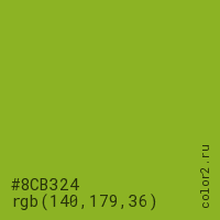 Цвет #8CB324 в цветовой модели RGB обозначается тремя октетами (140, 179, 36) в десятичном формате и #8CB324 в шестнадцатиричном (hex) формате, которые являются интенсивностью красного 140 (hex 8C), интенсивность зелёного 179 (hex B3) и интенсивность синего 36 (hex 24).