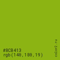 Цвет #8CB413 в цветовой модели RGB обозначается тремя октетами (140, 180, 19) в десятичном формате и #8CB413 в шестнадцатиричном (hex) формате, которые являются интенсивностью красного 140 (hex 8C), интенсивность зелёного 180 (hex B4) и интенсивность синего 19 (hex 13).