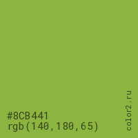 Цвет #8CB441 в цветовой модели RGB обозначается тремя октетами (140, 180, 65) в десятичном формате и #8CB441 в шестнадцатиричном (hex) формате, которые являются интенсивностью красного 140 (hex 8C), интенсивность зелёного 180 (hex B4) и интенсивность синего 65 (hex 41).