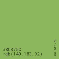 Цвет #8CB75C в цветовой модели RGB обозначается тремя октетами (140, 183, 92) в десятичном формате и #8CB75C в шестнадцатиричном (hex) формате, которые являются интенсивностью красного 140 (hex 8C), интенсивность зелёного 183 (hex B7) и интенсивность синего 92 (hex 5C).
