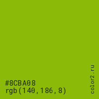 Цвет #8CBA08 в цветовой модели RGB обозначается тремя октетами (140, 186, 8) в десятичном формате и #8CBA08 в шестнадцатиричном (hex) формате, которые являются интенсивностью красного 140 (hex 8C), интенсивность зелёного 186 (hex BA) и интенсивность синего 8 (hex 08).