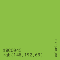 Цвет #8CC045 в цветовой модели RGB обозначается тремя октетами (140, 192, 69) в десятичном формате и #8CC045 в шестнадцатиричном (hex) формате, которые являются интенсивностью красного 140 (hex 8C), интенсивность зелёного 192 (hex C0) и интенсивность синего 69 (hex 45).