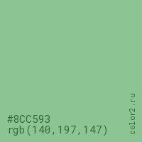 Цвет #8CC593 в цветовой модели RGB обозначается тремя октетами (140, 197, 147) в десятичном формате и #8CC593 в шестнадцатиричном (hex) формате, которые являются интенсивностью красного 140 (hex 8C), интенсивность зелёного 197 (hex C5) и интенсивность синего 147 (hex 93).