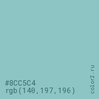 Цвет #8CC5C4 в цветовой модели RGB обозначается тремя октетами (140, 197, 196) в десятичном формате и #8CC5C4 в шестнадцатиричном (hex) формате, которые являются интенсивностью красного 140 (hex 8C), интенсивность зелёного 197 (hex C5) и интенсивность синего 196 (hex C4).