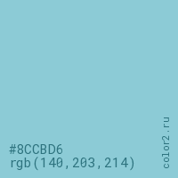 Цвет #8CCBD6 в цветовой модели RGB обозначается тремя октетами (140, 203, 214) в десятичном формате и #8CCBD6 в шестнадцатиричном (hex) формате, которые являются интенсивностью красного 140 (hex 8C), интенсивность зелёного 203 (hex CB) и интенсивность синего 214 (hex D6).