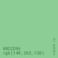 Цвет #8CCD96 в цветовой модели RGB обозначается тремя октетами (140, 205, 150) в десятичном формате и #8CCD96 в шестнадцатиричном (hex) формате, которые являются интенсивностью красного 140 (hex 8C), интенсивность зелёного 205 (hex CD) и интенсивность синего 150 (hex 96).