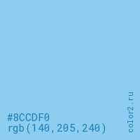 Цвет #8CCDF0 в цветовой модели RGB обозначается тремя октетами (140, 205, 240) в десятичном формате и #8CCDF0 в шестнадцатиричном (hex) формате, которые являются интенсивностью красного 140 (hex 8C), интенсивность зелёного 205 (hex CD) и интенсивность синего 240 (hex F0).