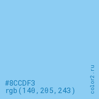 Цвет #8CCDF3 в цветовой модели RGB обозначается тремя октетами (140, 205, 243) в десятичном формате и #8CCDF3 в шестнадцатиричном (hex) формате, которые являются интенсивностью красного 140 (hex 8C), интенсивность зелёного 205 (hex CD) и интенсивность синего 243 (hex F3).