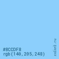 Цвет #8CCDF8 в цветовой модели RGB обозначается тремя октетами (140, 205, 248) в десятичном формате и #8CCDF8 в шестнадцатиричном (hex) формате, которые являются интенсивностью красного 140 (hex 8C), интенсивность зелёного 205 (hex CD) и интенсивность синего 248 (hex F8).