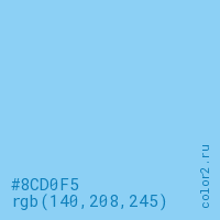 Цвет #8CD0F5 в цветовой модели RGB обозначается тремя октетами (140, 208, 245) в десятичном формате и #8CD0F5 в шестнадцатиричном (hex) формате, которые являются интенсивностью красного 140 (hex 8C), интенсивность зелёного 208 (hex D0) и интенсивность синего 245 (hex F5).