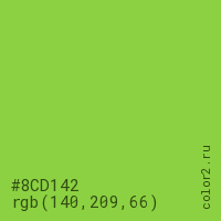 Цвет #8CD142 в цветовой модели RGB обозначается тремя октетами (140, 209, 66) в десятичном формате и #8CD142 в шестнадцатиричном (hex) формате, которые являются интенсивностью красного 140 (hex 8C), интенсивность зелёного 209 (hex D1) и интенсивность синего 66 (hex 42).