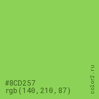 Цвет #8CD257 в цветовой модели RGB обозначается тремя октетами (140, 210, 87) в десятичном формате и #8CD257 в шестнадцатиричном (hex) формате, которые являются интенсивностью красного 140 (hex 8C), интенсивность зелёного 210 (hex D2) и интенсивность синего 87 (hex 57).