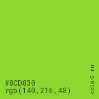 Цвет #8CD830 в цветовой модели RGB обозначается тремя октетами (140, 216, 48) в десятичном формате и #8CD830 в шестнадцатиричном (hex) формате, которые являются интенсивностью красного 140 (hex 8C), интенсивность зелёного 216 (hex D8) и интенсивность синего 48 (hex 30).