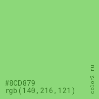 Цвет #8CD879 в цветовой модели RGB обозначается тремя октетами (140, 216, 121) в десятичном формате и #8CD879 в шестнадцатиричном (hex) формате, которые являются интенсивностью красного 140 (hex 8C), интенсивность зелёного 216 (hex D8) и интенсивность синего 121 (hex 79).