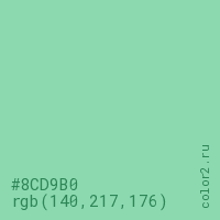 Цвет #8CD9B0 в цветовой модели RGB обозначается тремя октетами (140, 217, 176) в десятичном формате и #8CD9B0 в шестнадцатиричном (hex) формате, которые являются интенсивностью красного 140 (hex 8C), интенсивность зелёного 217 (hex D9) и интенсивность синего 176 (hex B0).
