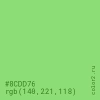Цвет #8CDD76 в цветовой модели RGB обозначается тремя октетами (140, 221, 118) в десятичном формате и #8CDD76 в шестнадцатиричном (hex) формате, которые являются интенсивностью красного 140 (hex 8C), интенсивность зелёного 221 (hex DD) и интенсивность синего 118 (hex 76).