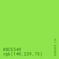 Цвет #8CE549 в цветовой модели RGB обозначается тремя октетами (140, 229, 73) в десятичном формате и #8CE549 в шестнадцатиричном (hex) формате, которые являются интенсивностью красного 140 (hex 8C), интенсивность зелёного 229 (hex E5) и интенсивность синего 73 (hex 49).